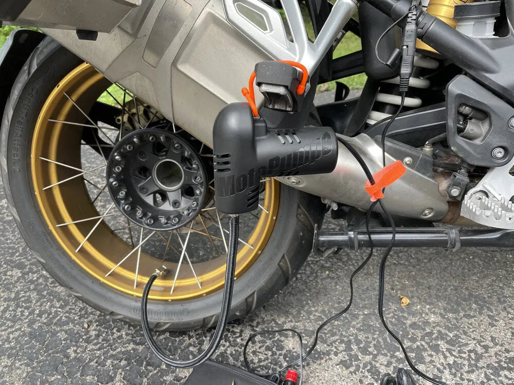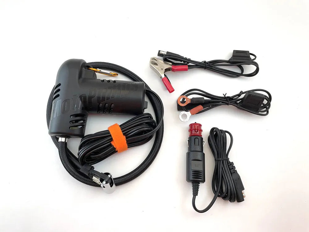 The MotoPumps Air Shot 2.1 Inflator is one of the smallest, lightest, full performance 12v inflators on the market. Powered by your bike’s 12v system, drawing about 7.5 a, weighing in just over a pound, and fitting easily in the palm of your hand, it is convenient to pack along and ready any time you are. Over the years, we have learned that lots of features and complexity can multiply your points of failure. This inflator is Round the World reliable, now with a detachable air hose.