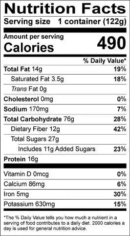 Gluten-Free Rolled Oats (Whole Grain Oats), Whole Grain Quinoa Flakes, Dried Zante Currants, Coconut Sugar, Raw Sunflower Seeds, Raw Pumpkin Seeds, Banana Flakes (Dehydrated Banana), Unsulfured & Unsweetened Shredded Coconut, Chia Seeds, Hulled Hemp Seed Hearts, Ground Cinnamon, Sea Salt, Ground Turmeric, Cardamom