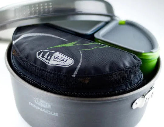 Integrated 12 piece kitchen set has every utensil for a gourmet backpacking trip neatly organized into a lightweight tote that keeps everything organized and nests within the nFORM Crossover System Cooksets.