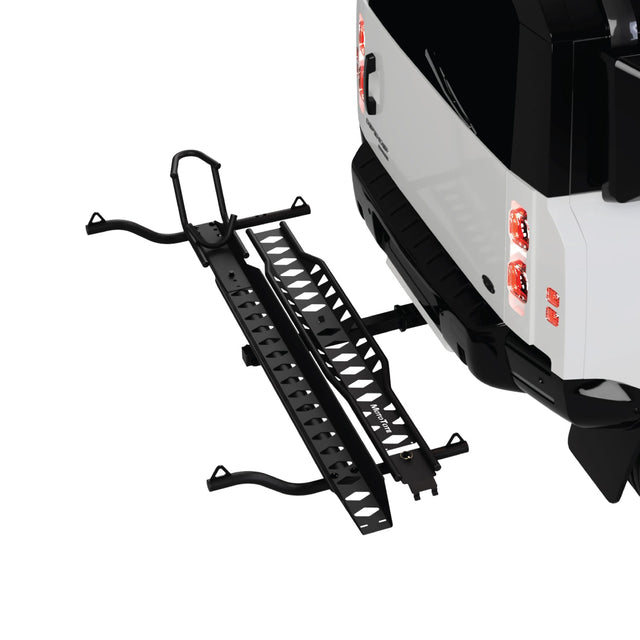Innovative, lightweight, maximum-stability motorcycle carrier for standard-size tire motorcycles up to 600 lbs. (272 kg.); dirt bikes, scooters, and more.