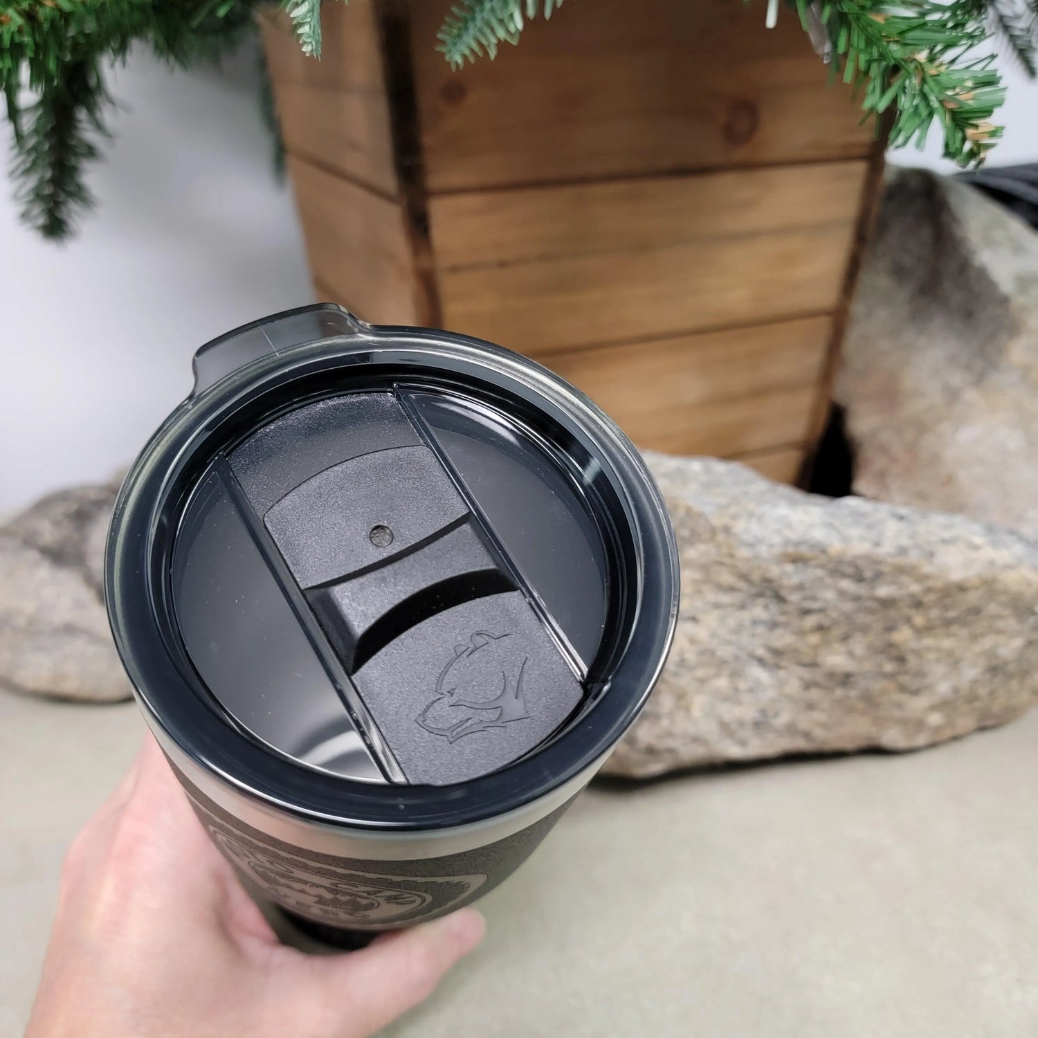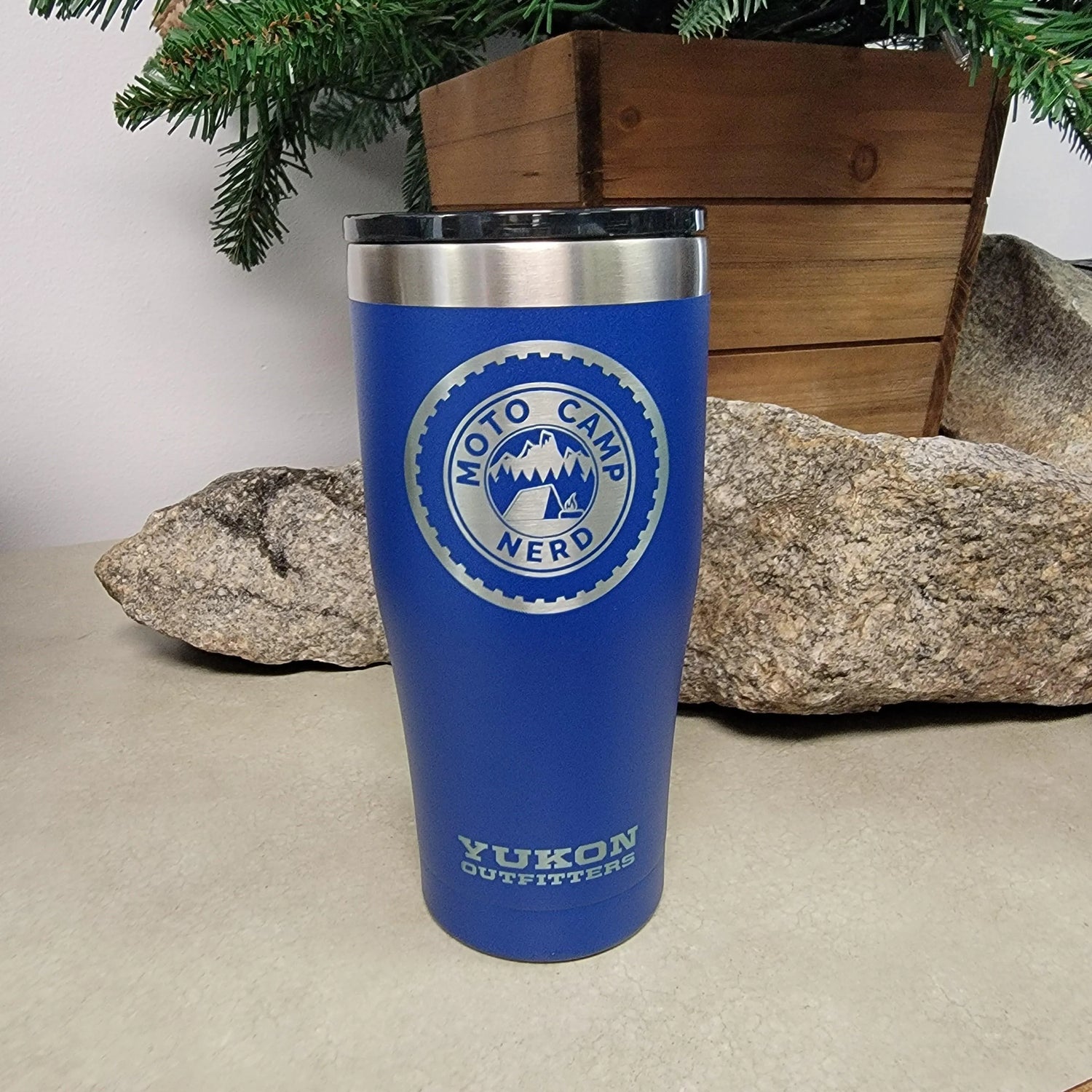 Yukon Outfitter Tumbler etched with the Moto Camp Nerd logo.