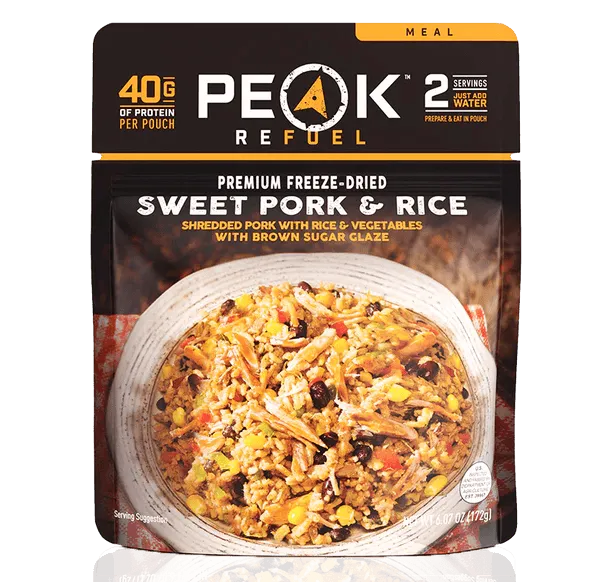 When it’s time to settle in by the fire, savor it sweeter with Peak Refuel’s Sweet Pork and Rice. With a kick of chili peppers, dive into this medley of tender pulled pork, white rice, black beans, veggies, and a dash of cilantro and spices. Oh, and did we mention our pork is made of, well, pork? Steering clear of fillers or artificial additives to give you the elevated meal you deserve after a long day outdoors. Recharge with 40 grams of protein, 50% of your daily iron, and 20% of your daily potassium and can get back up the next day to start out like it’s day 1.