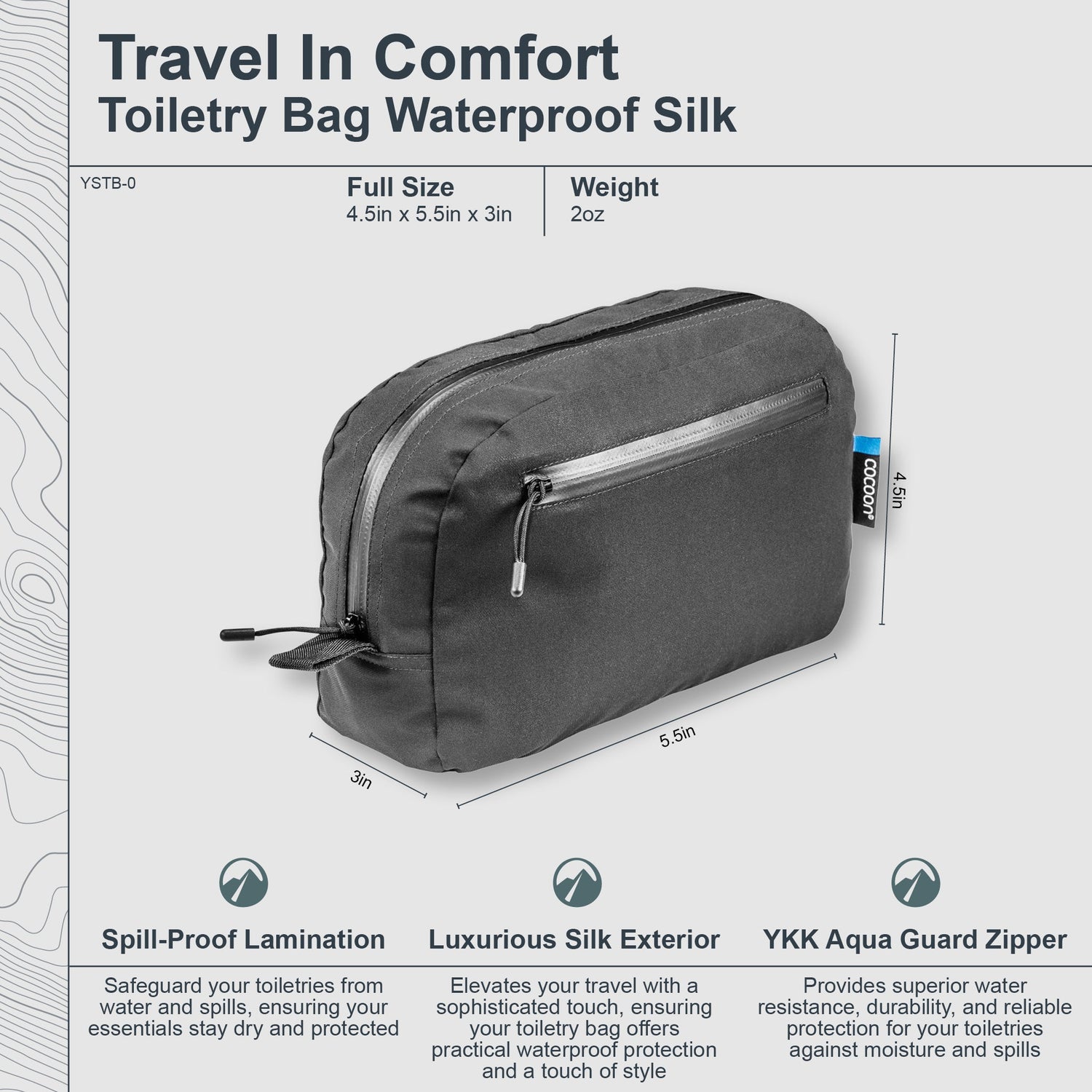 Crafted from 100% Monsoon Silk™ with TPU lamination inside, this toiletry bag offers unparalleled durability and elegance. The waterproof and spill-proof laminate interior ensures your belongings stay dry and protected, even in the most challenging conditions. Available in five elegant colors, this bag is as stylish as it is practical. Featuring an external pocket and large opening top, it provides easy access to your essentials while keeping them neatly organized. With YKK AquaGuard® water-repellent zippers, this bag is designed to withstand the elements and keep your belongings secure on your travels.