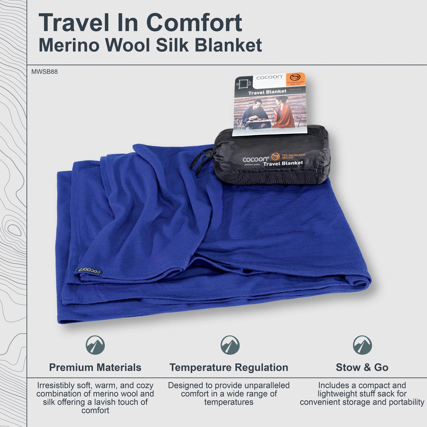 Indulge in the softness of the merino-silk fabric blend, which offers a heavenly touch against your skin. The blanket's generous dimensions of 70" x 55" ensure ample coverage, while its lightweight construction, weighing just 13.8 oz, makes it effortlessly portable. Each blanket comes with it's own compact stuff sack.