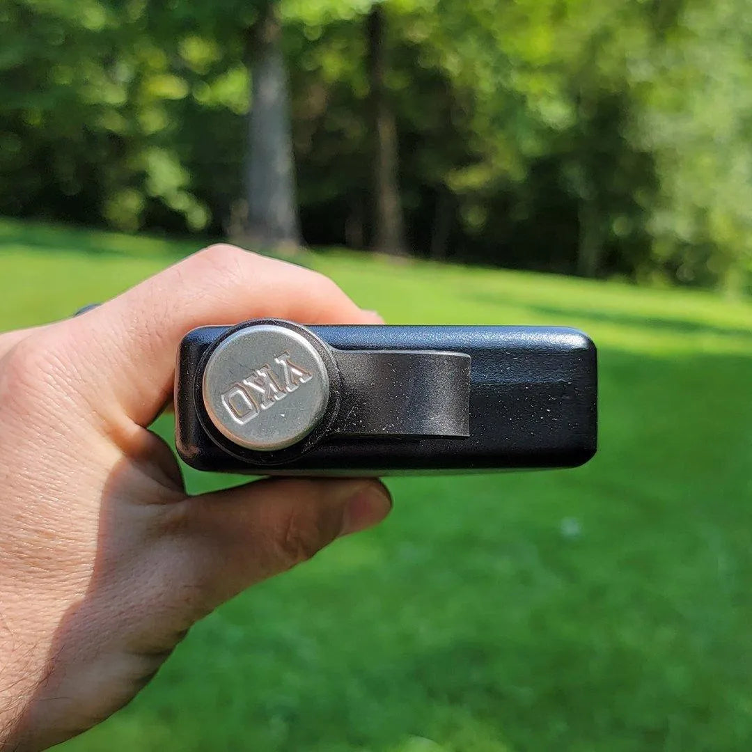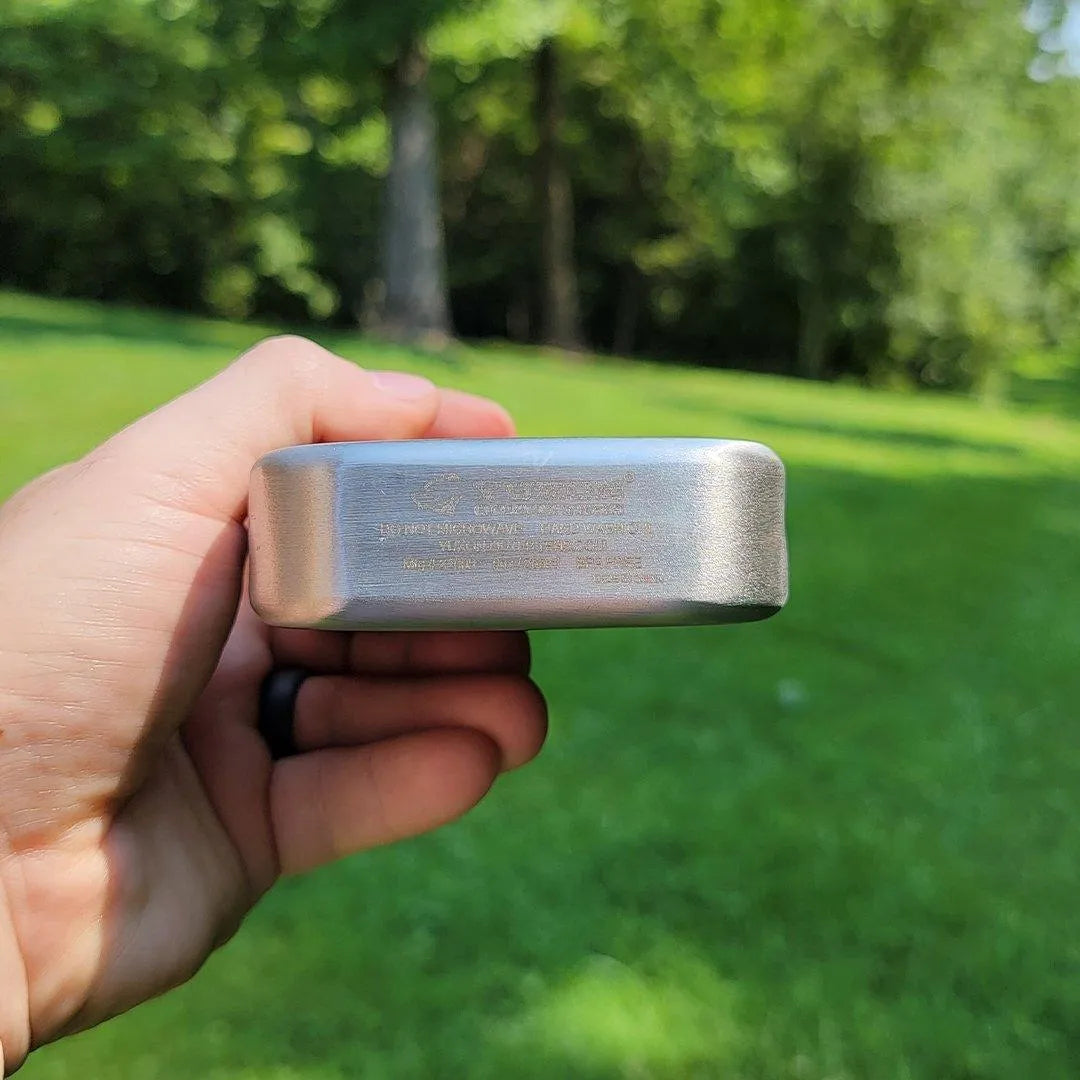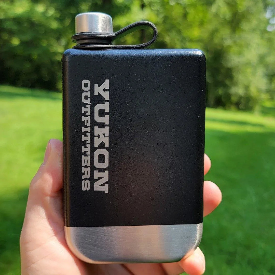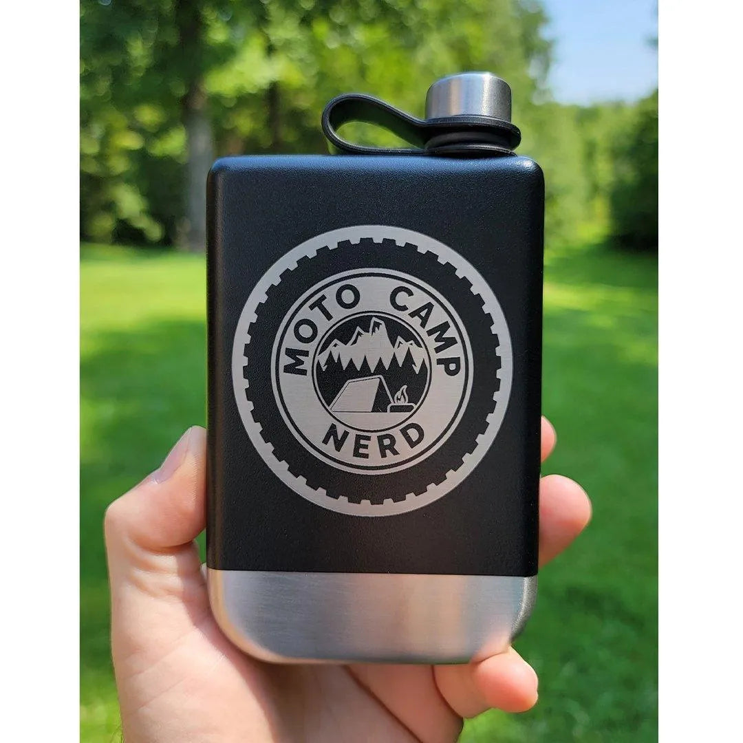 Yukon Outfitters Highline Flask etched with the Moto Camp Nerd logo.