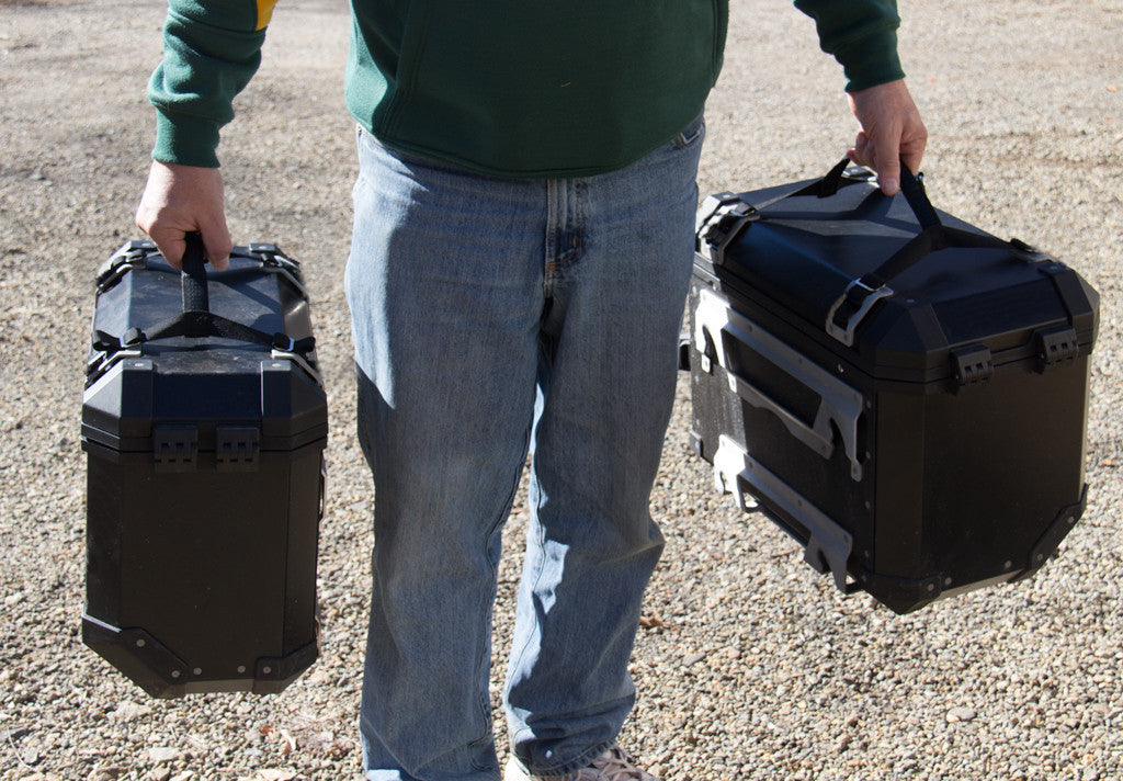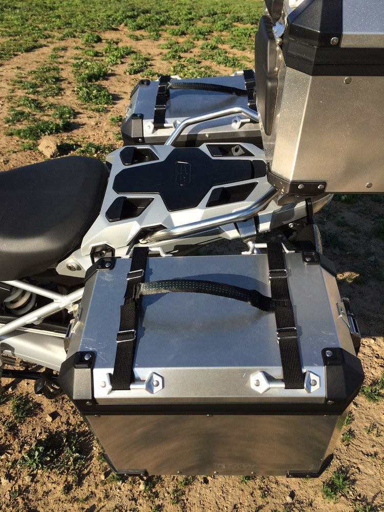 *Note: Most pannier mounting points can easily accommodate the Bag Snake. However, panniers such as Trax brand and the OEM Suzuki V-Strom panniers have low clearance mount points. For these style panniers you will need to add the optional low profile ring loops.