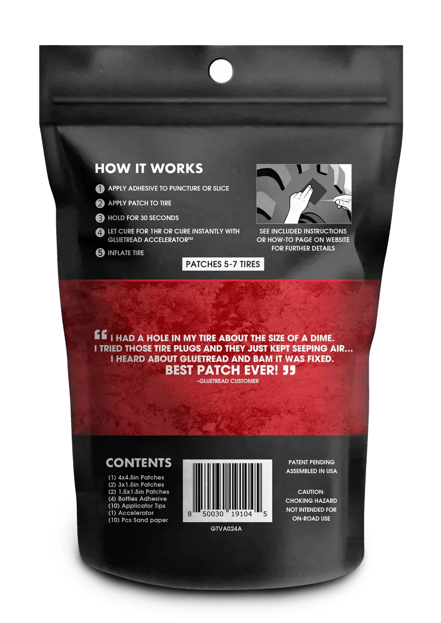 The GlueTread SxS Kit is a combination of all other GlueTread Kits plus some extras. Patches 5-7 tire.