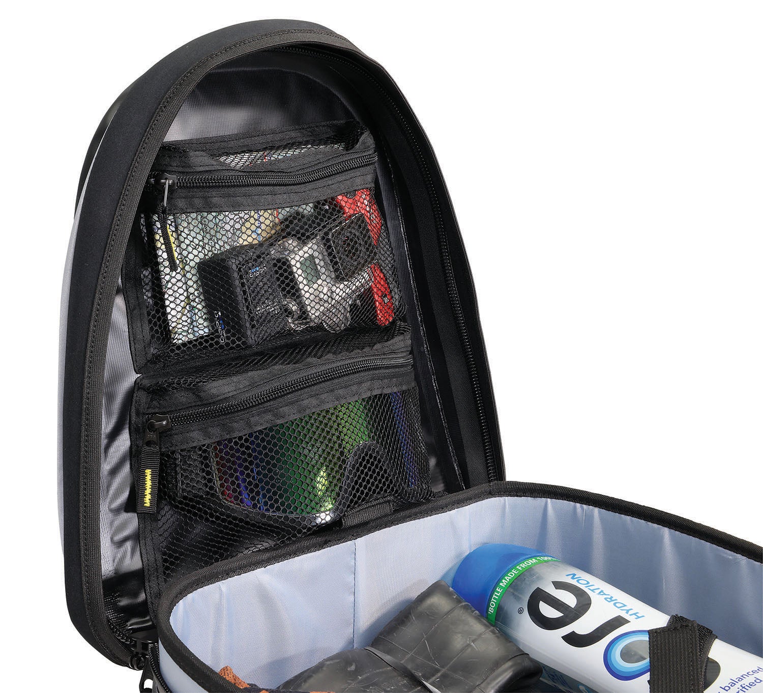 - Clear mesh pockets under lid to store smaller items