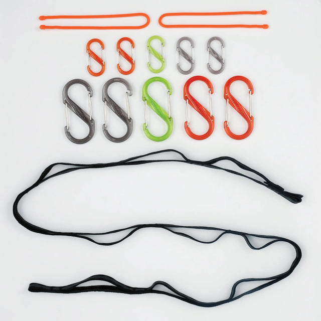 Made of high quality, wear-resistant webbing, the GearLine® Organization System features sturdy S-Biner double-gated carabiner clips in alternating sizes, each attached to its own individual sturdy loop, along with Gear Tie Reusable Twist Ties on each end. Just attach whatever tools, gear, gadgets, or clothing you want to each S-Biner and hang the GearLine® to any hook or knob - wherever it will be most convenient. Go vertical when you want to maximize storage and save wall space. Hang horizontally to keep things easily accessible at eye level or quickly dry out gear. Each S-Biner clips securely closed and unclips easily for fast, convenient attachment and detachment, and can easily be interchanged.