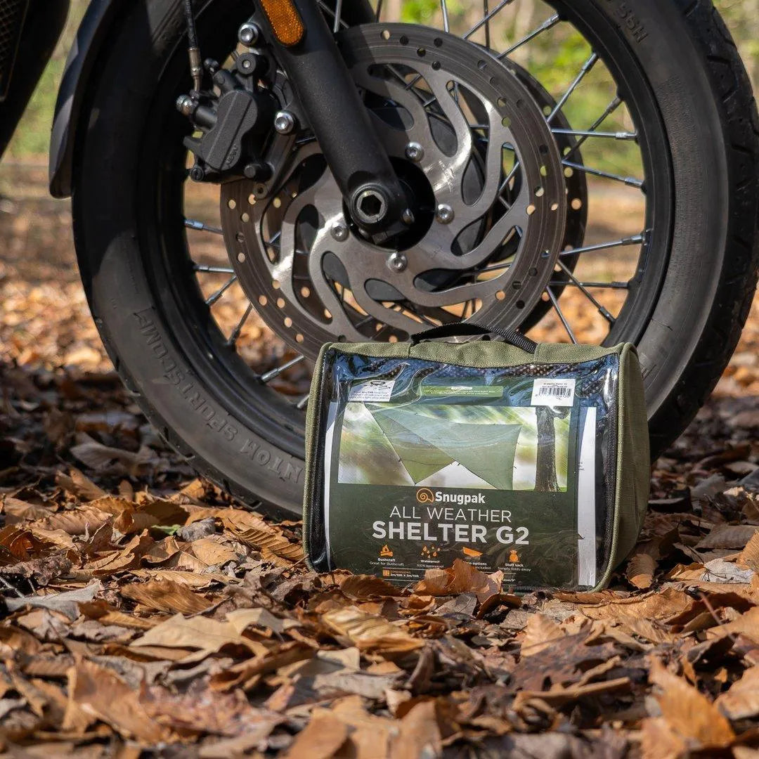 This one is for the minimalist motorcycle camper. The Snugpak All Weather Shelter is an impressive 10 x 10 ft tarp shelter, designed for Bush craft, Wild Camping, Group Activities and Military use. It is the perfect complement to any outdoor pack and will provide versatile protection from all-weather elements.