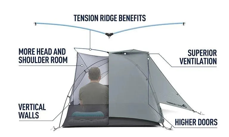 • Tension Ridge raises the tent’s shape upwards for more usable head-and-shoulder space and creates truly higher doors for easier entry and more vestibule storage.