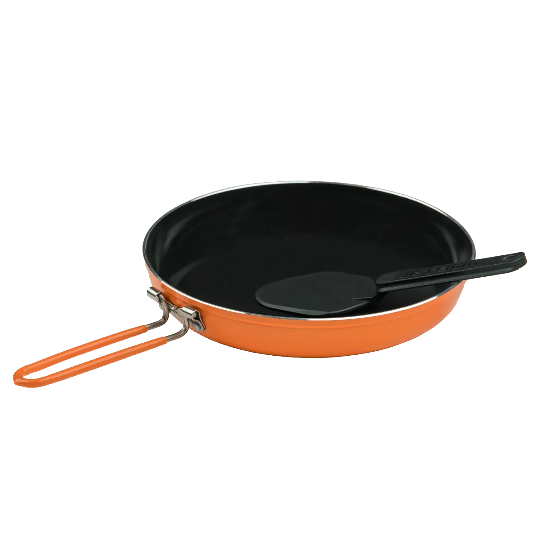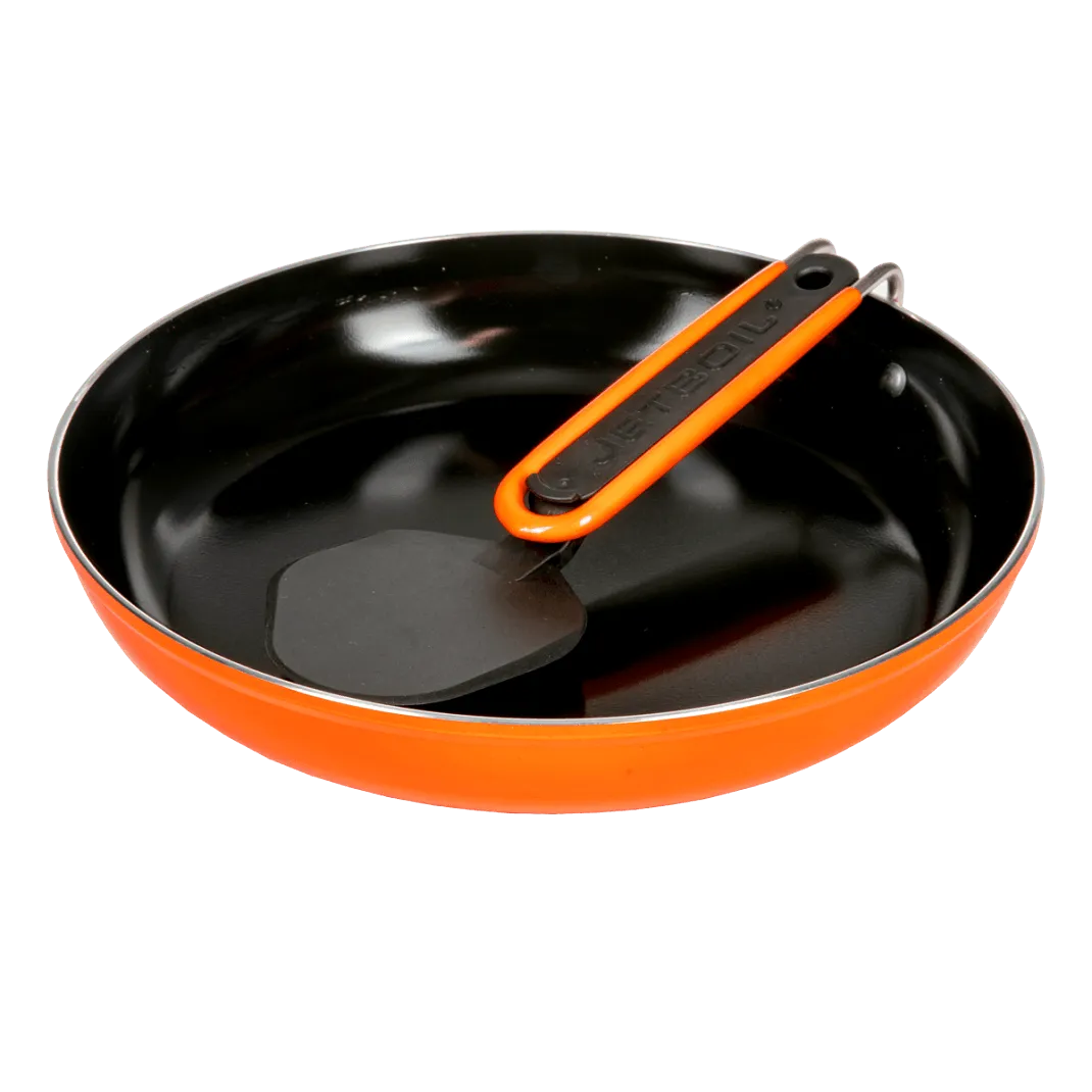 The nonstick Summit Skillet packs the performance and punch of home cookware into a compact, lightweight, elegant, solution designed for the backpacker set. The ceramic-coated nonstick aluminum construction heats quickly and evenly, expanding the potential of backcountry cooking. Coated with a ceramic nonstick surface, the skillet releases eggs, pancakes, and other foods easily, making cleanup a breeze. A perfectly angled turner nests into the handle, helping you flip foods without fuss. The skillet pairs perfectly with Jetboil-regulated cooking systems and the Jetboil pot support. Skillet measures 8 by 8.5 by 1.9 inches and weighs 10.6 ounces.
